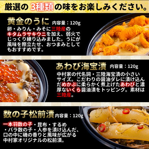 商品説明商品名平泉金宝漬 名称 水産加工品原材料名■あわび海宝漬 めかぶ醤油漬(めかぶ(三陸産)、カラフトシシャモ卵、しょうゆ、砂糖、みりん、唐辛子、食塩)(国内製造)、いくら醤油漬(いくら(国産)、しょうゆ、砂糖、清酒、醸造酢)、煮あわび(あわび(国産)、清酒、食塩)/酒精、調味料(アミノ酸等)、カラメル色素、酸味料、増粘剤(キサンタンガム)、甘味料(カンゾウ)、(一部に小麦・あわび・いくら・大豆を含む) ■黄金のうに鶏卵(岩手県産)、うに(三陸産)、みりん、みそ/酒精、(一部に卵・大豆を含む) ■数の子松前漬 松前漬(数の子(デンマーク産)、清酒、しょうゆ、いか(北海道産)、昆布、砂糖、発酵調味料、還元水飴、醸造酢、唐辛子)(国内製造)、味付数の子(数の子(アメリカ産)、しょうゆ、発酵調味料、鰹エキス、砂糖、食塩、昆布エキス)/調味料(アミノ酸等)、酒精、増粘多糖類、ソルビット、(一部に小麦・いか・さば・大豆を含む) 内容量各120g賞味期限製造から90日(発送する商品は40日以上お日持ちするものです)保存方法-18℃以下で保存して下さい。