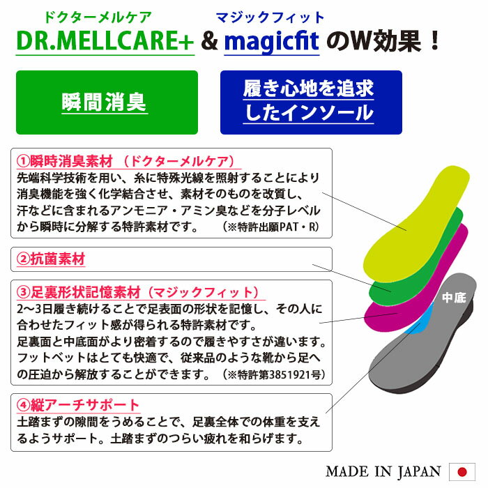 (※特許出願PAT・R) ■抗菌素材 ■足裏形状記憶素材(マジックフィット) 2〜3日履き続けることで足表面の形状を記憶し、その人に合わせたフィット感が得られる特許素材です。
